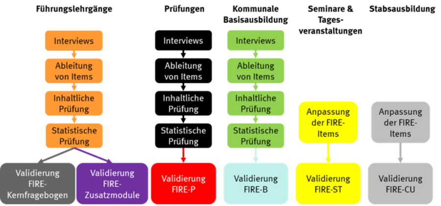 Alle Fragebögen der FIRE-Toolbox wurden im Rahmen von Masterarbeiten systematisch entwickelt. Der Entwicklungsprozess gliederte sich in mehrere Abschnitte, die in der Abbildung dargestellt sind.