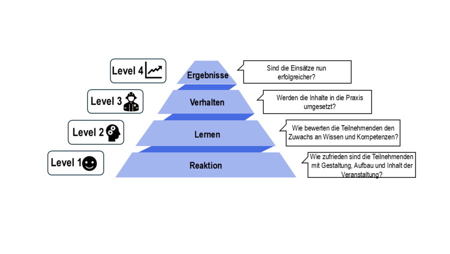 Das Evaluationsmodell, welches wir in FIRE nutzen, unterteilt die Evaluation deshalb in vier Stufen, welche aufeinander aufbauen. Zunächst sollte die Reaktion der Teilnehmenden auf die Lehrveranstaltung positiv sein. Dies ist eine Voraussetzung dafür, dass sich ein Lernerfolg einstellt. Erst wenn ein Lernerfolg vorliegt, können die Inhalte der Lehrveranstaltung in Verhalten transferiert werden. Die Verhaltensänderung führt schließlich dazu, dass sich die Lehrveranstaltung in konkreten Ergebnissen niederschlagen kann (z.B. geringere Anzahl an Fehlern). Diese vier Stufen werden in der folgenden Grafik illustriert.